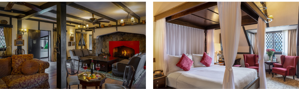 The Lakehouse offers an intimate, homely charm — it’s more like a lived-in country house with long corridors, antique wood flooring, and a mix of warm timber beams, whitewashed walls, and cosy deep sofas. Rooms lean into that mood with four-poster beds, armchairs, framed pictures, and old-style touches like dial-up phones for room service.