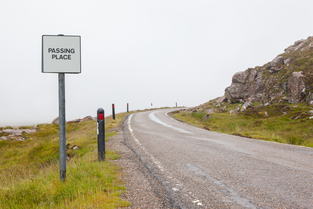 - Single-track roads and passing places: Many Highland and rural routes are single-track roads with designated passing places. These are not for parking or stopping to take photos – never block a passing place, as they are essential for allowing vehicles to pass each other safely.