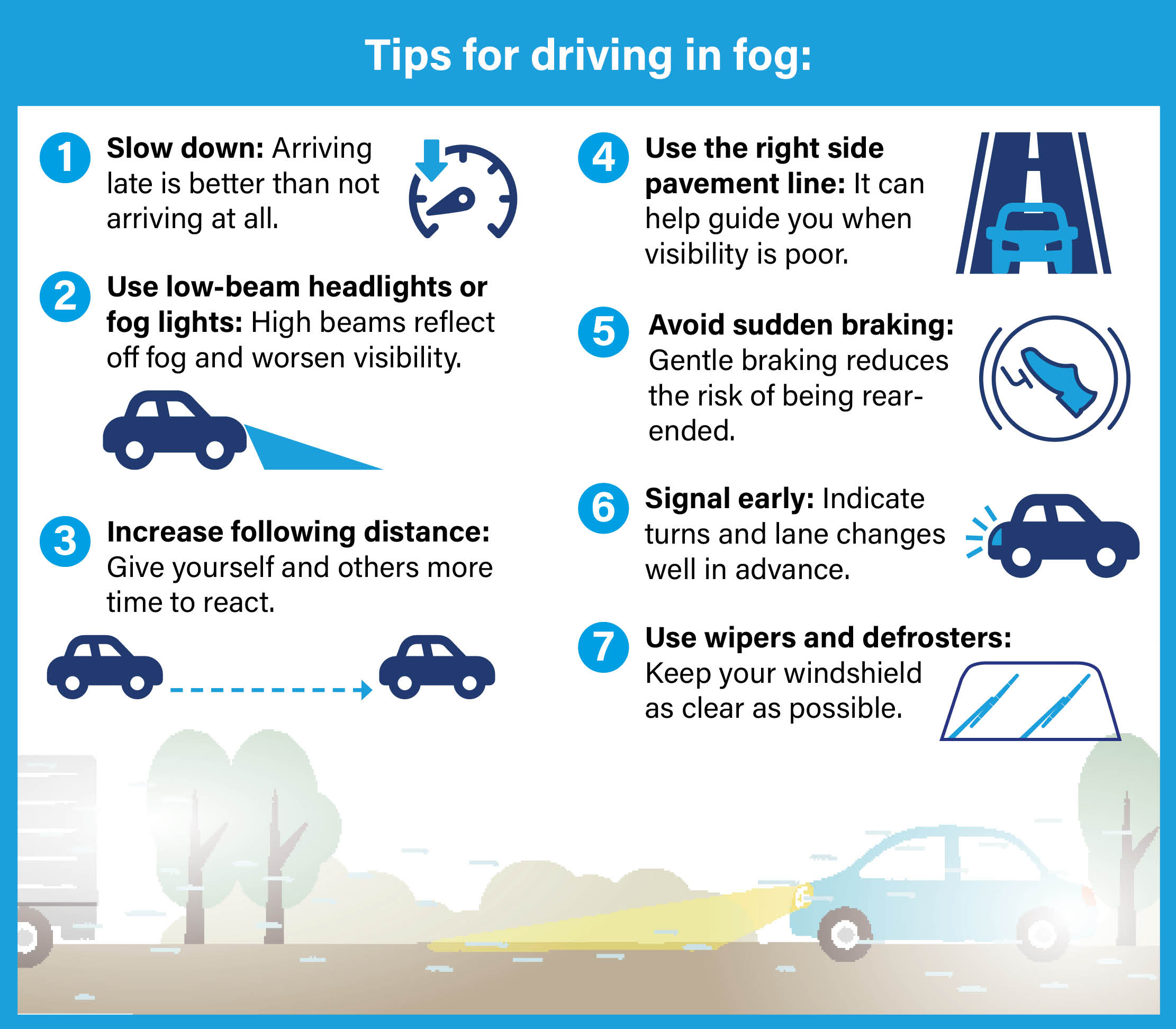 - Slow down, as reduced visibility means you need more time to react to hazards.