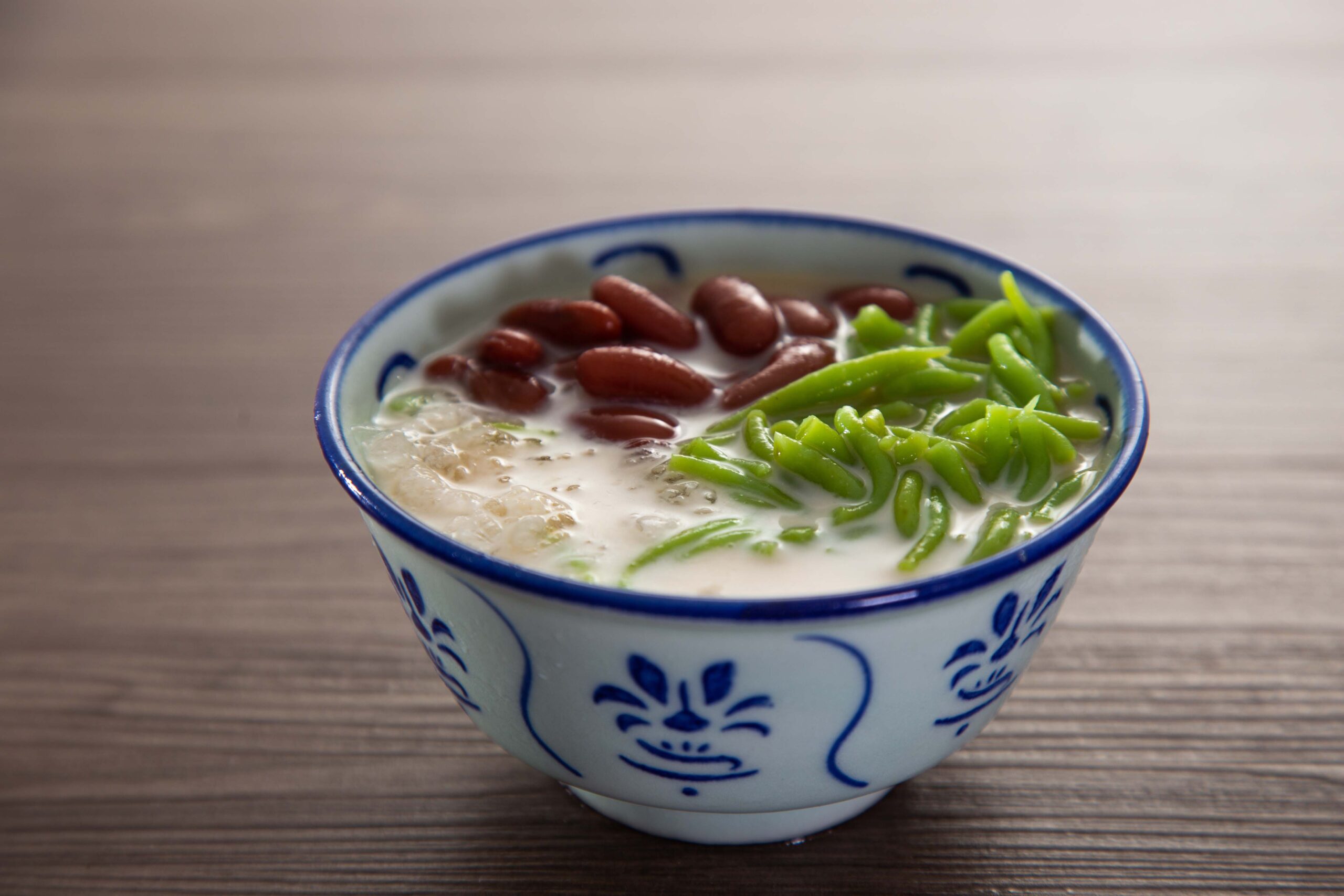 A cooling dessert of shaved ice, coconut milk, palm sugar syrup, and green rice flour jelly noodles.